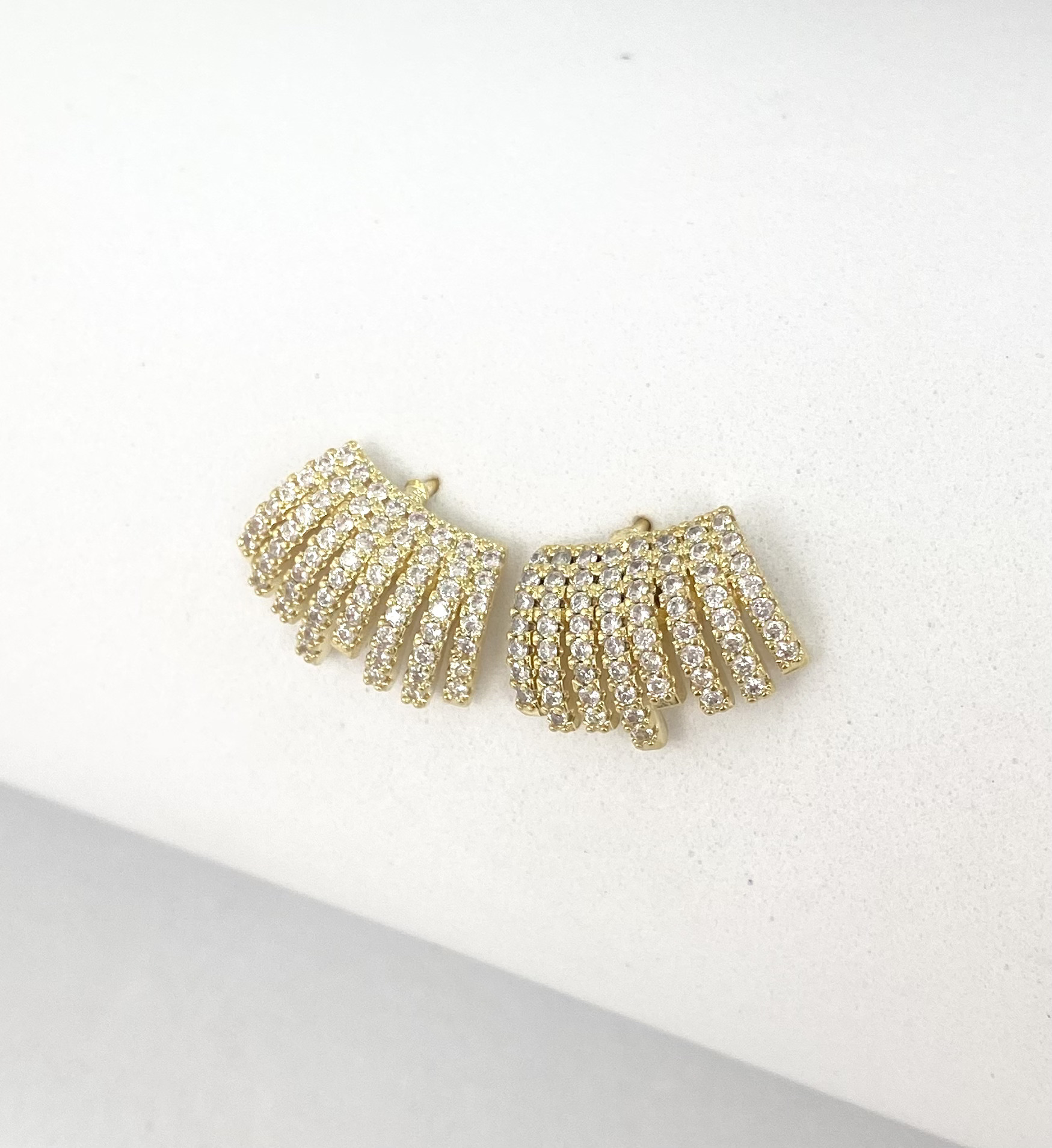 Brinco em formato de cascata, inteiro cravejado em zirconias cristais, no banho prata e ouro hipoalergenicos.