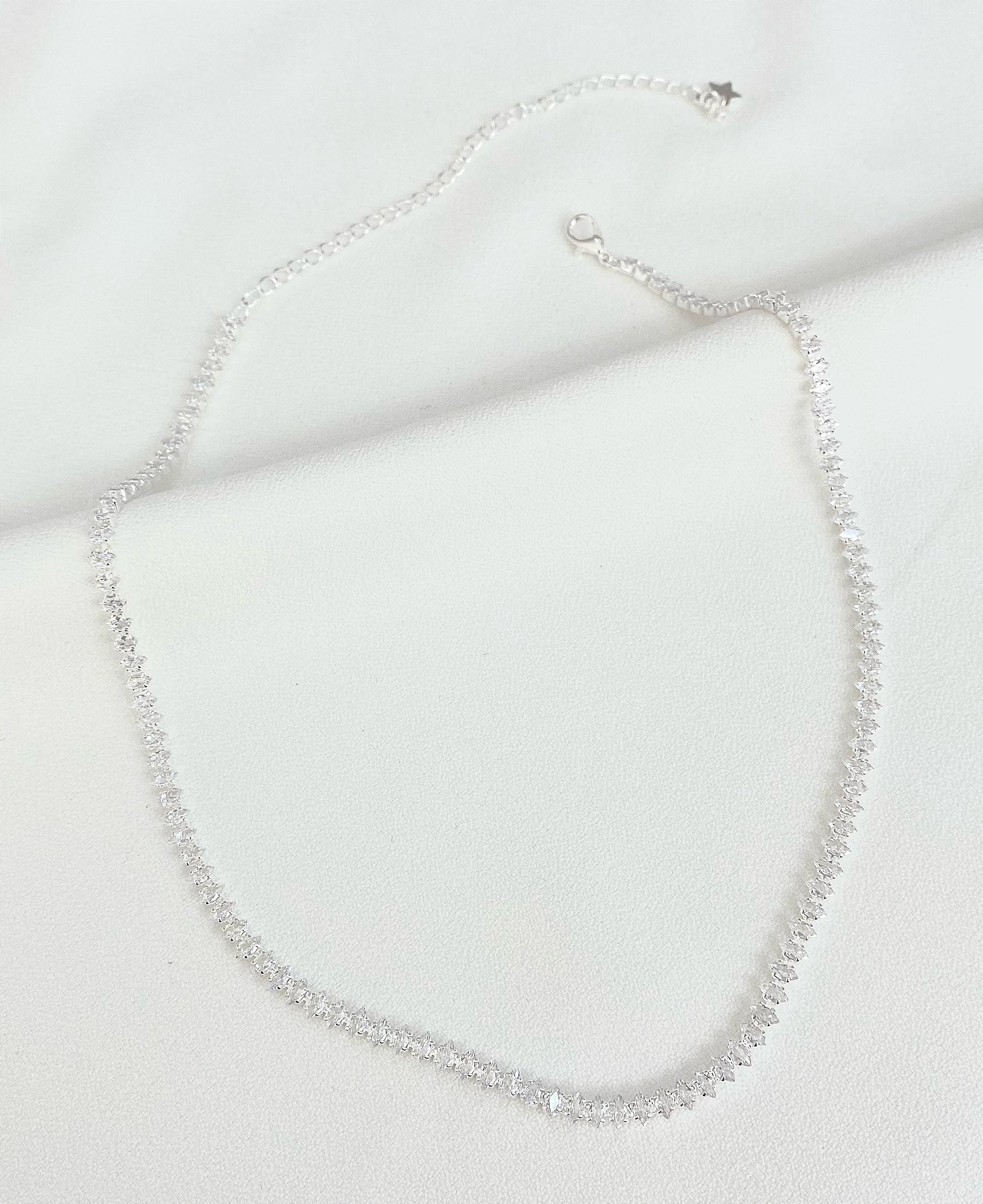 Choker riviera em formato navetes de zirconia cristal, no banho prata hipoalergenico, tamanho 40cm com 10cm de extensor. Podendo ser usada como gargantilha também. Soldada na parte da frente impedindo que a peça vire no pescoço.