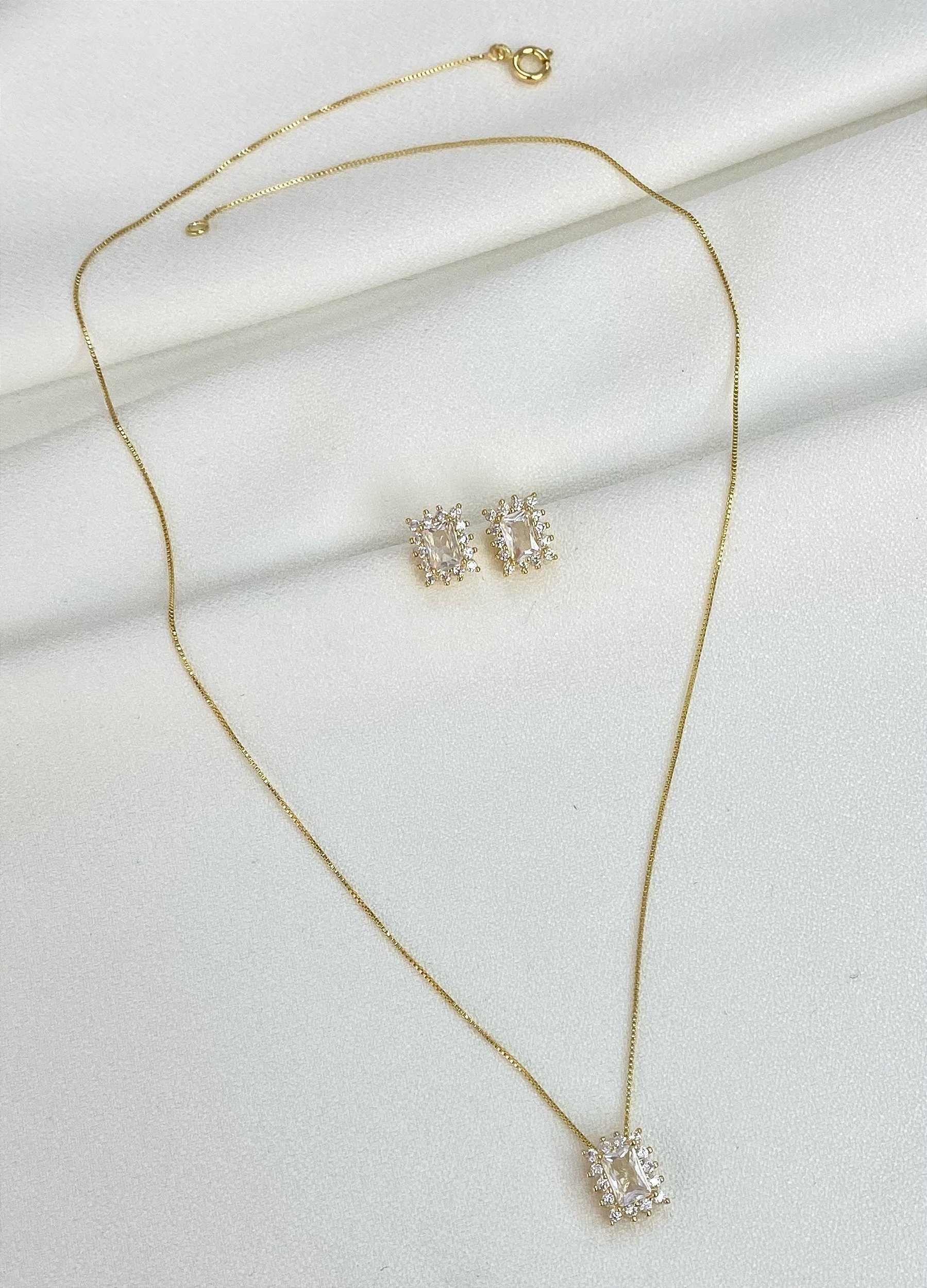 Conjunto de brinco e colar no formato quadrado com zirconia cravejada e mini zirconias cravejadas no banho de ouro18k hipoalergenico. Tamanho de 40cm de corrente + 10cm de extensor.