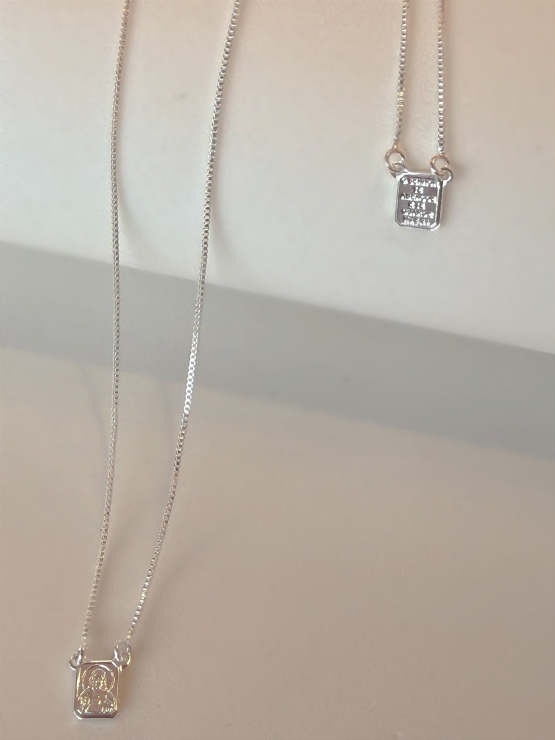 Escapulário tradicional unissex mini com a medalha do sagrado coração de Jesus em um lado e o outro com a mensagem "Pela graça sois salvos." No banho prata e ouro 18k, ambos hipoalergenicos. Tamanho 60cm