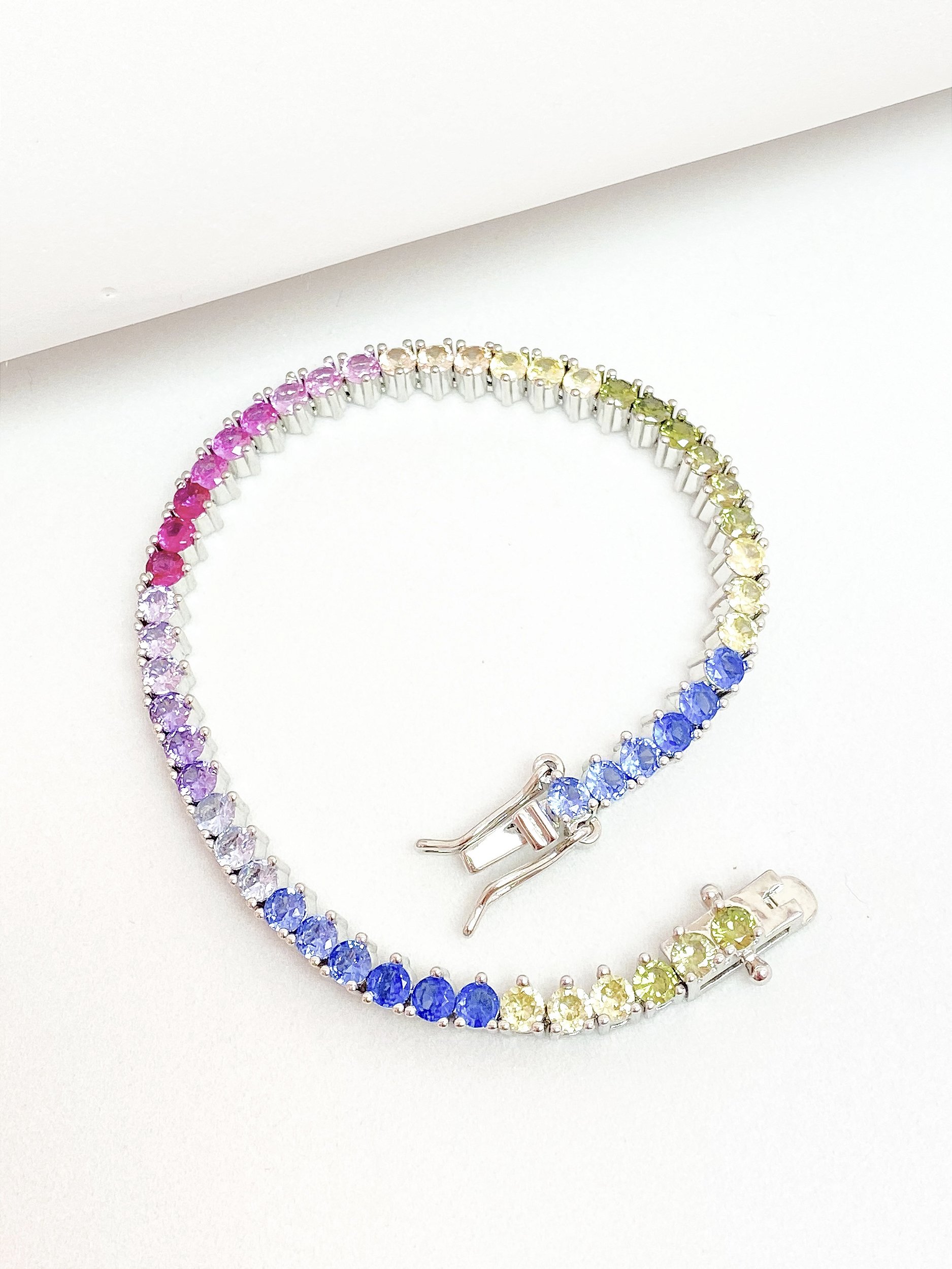 Pulseira riviera modelo 3 pontas, pedra tamanho 3mm, com as pedras coloridas e fecho gaveta (joia), no banho prata hipoalergenico, tamanho 18cm.