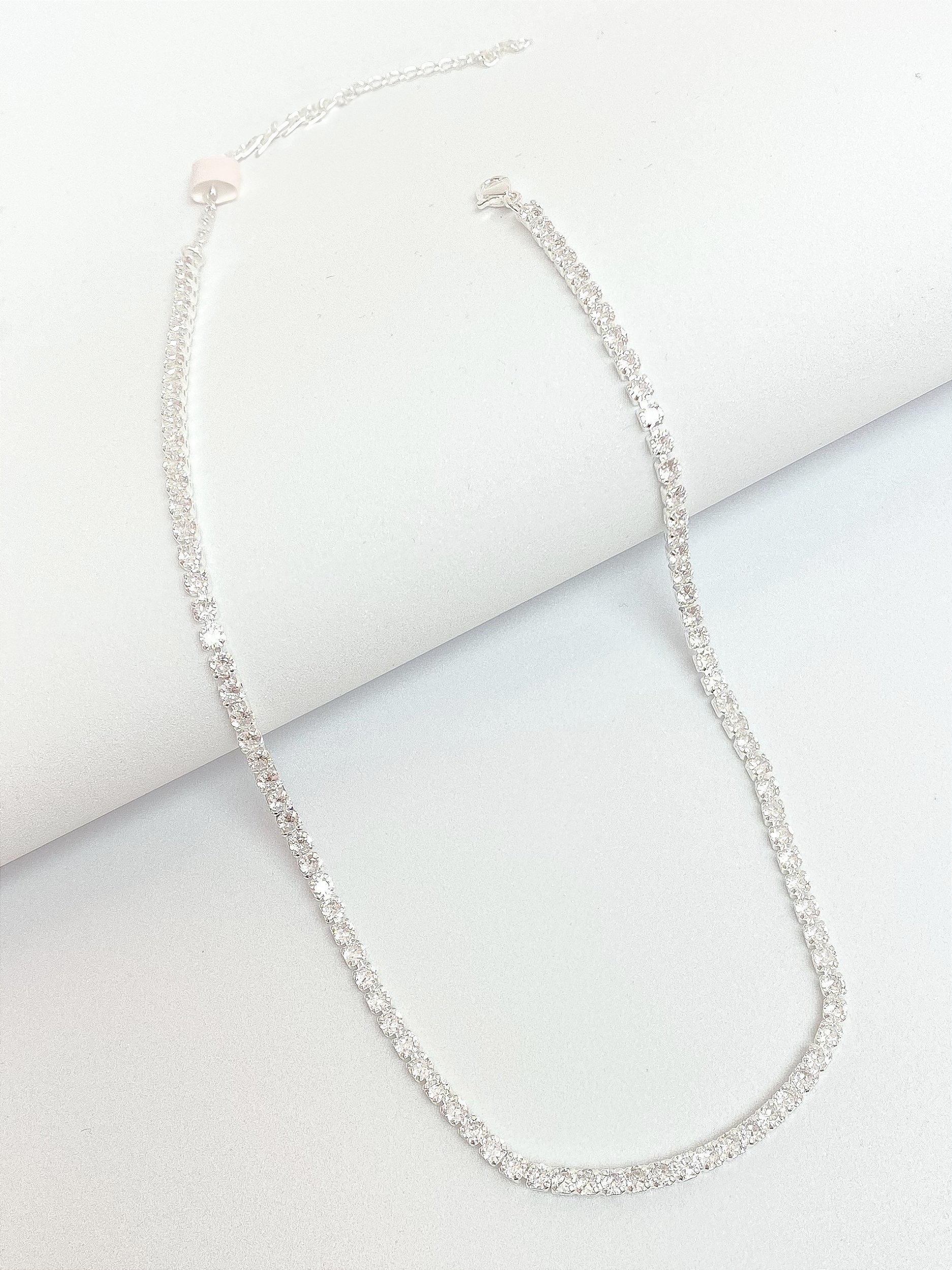 Riviera no formato da riviera luxo, no tamanho intermediário, soldada no centro para que não vire no pescoço. Tamanho 40cm, com extensor de 10cm. Disponível nos banhos prata e ouro 18k, ambos hipoalergênicos.
