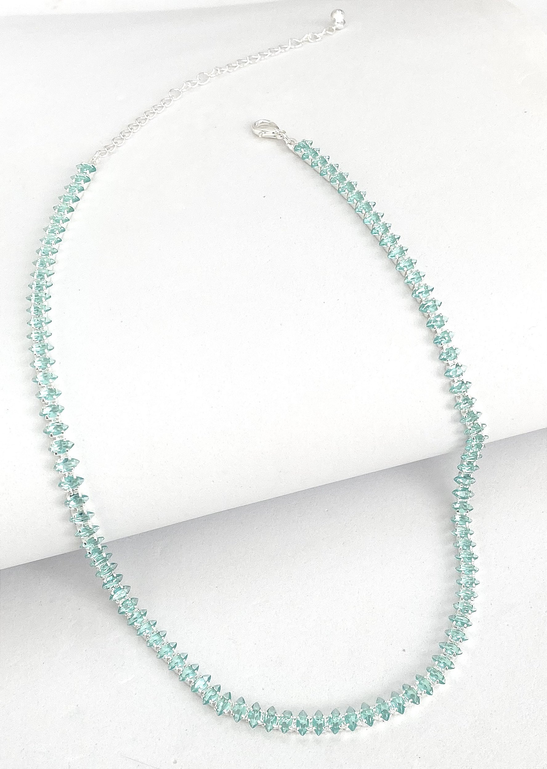 Choker riviera no acabamento de pedra navetes com pontas, cravejada em zirconias azul tiffany, modelo soldado que não vira no pescoço. Uma verdadeira jóia. Tamanho 35cm com extensor de 10cm. no banho prata hipoalergenico.
